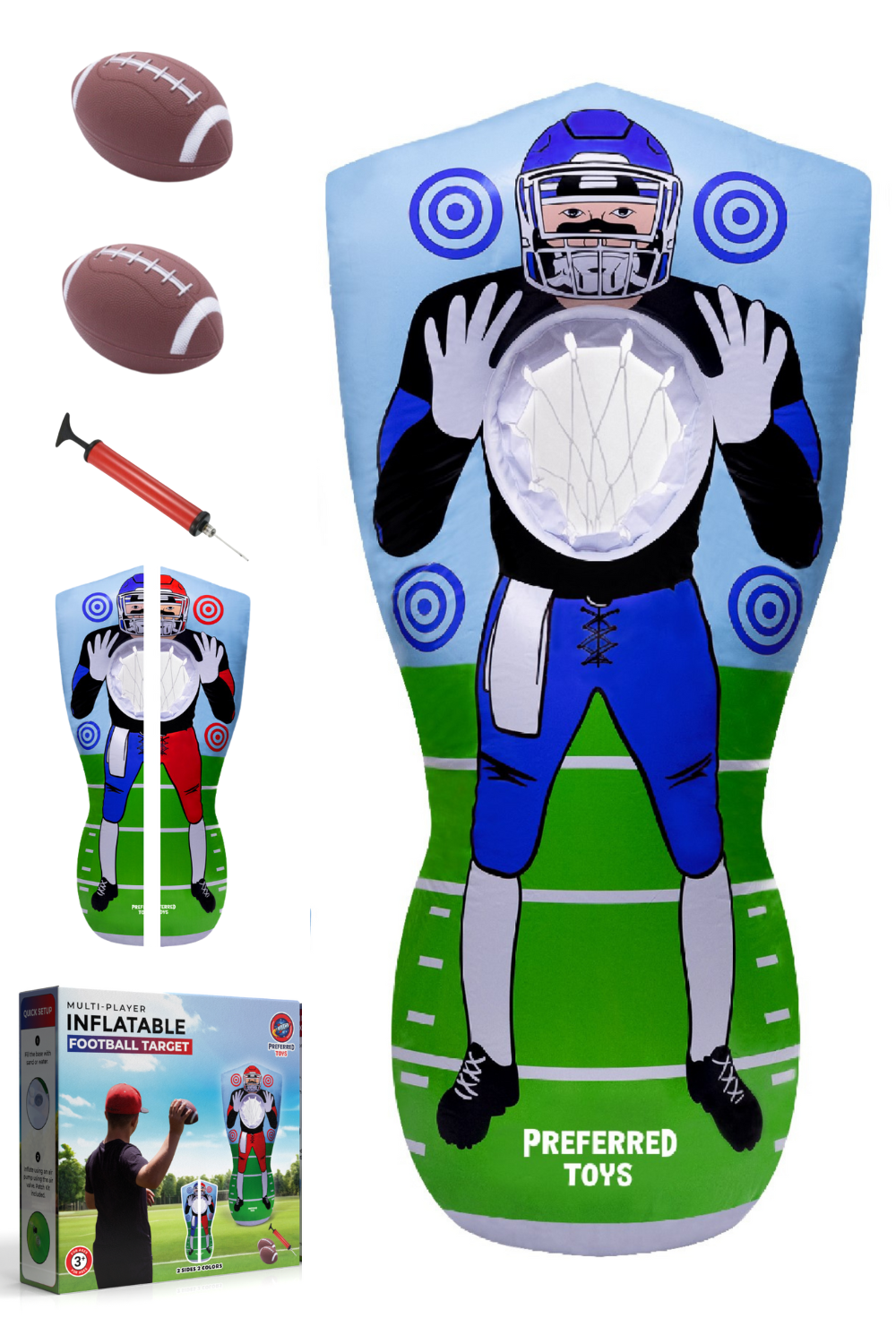 - THE FUNNEST INFLATABLE TARGET: Our inflatable football target flips to reveal two sides, red and blue, for twice the throwing challenge. Each side features 4 targets and a net, letting your kids practice or play with friends