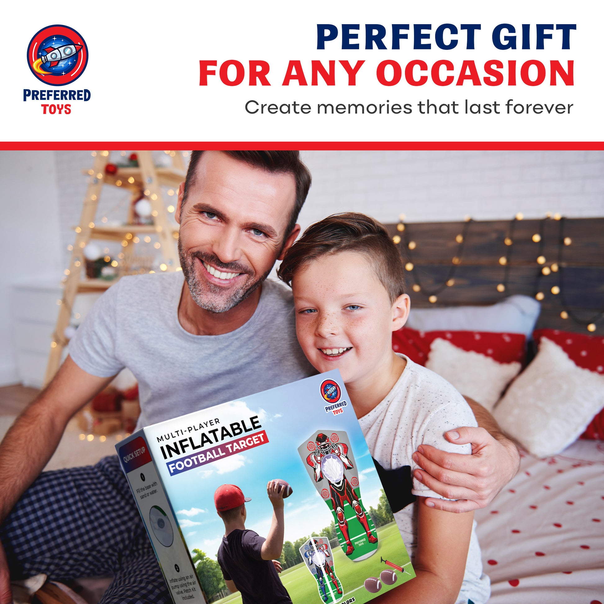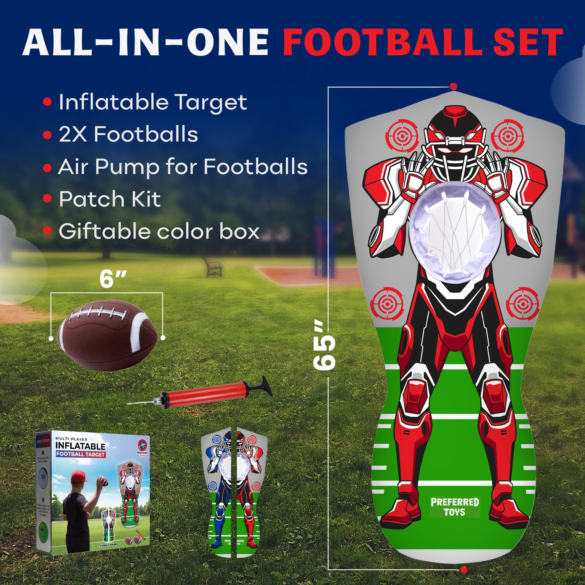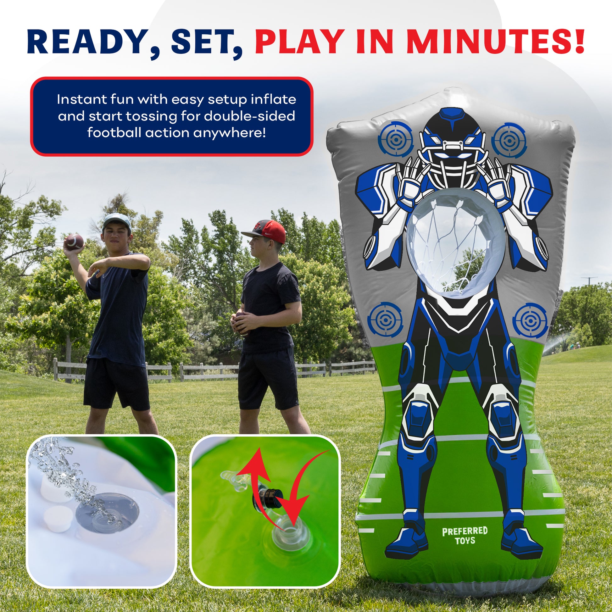 PORTABLE FOOTBALL TOYS: Take the inflatable fun anywhere! Deflating for easy storage and inflating in minutes, this target is ideal for birthday parties, beach days, camping trips, or backyard barbecues