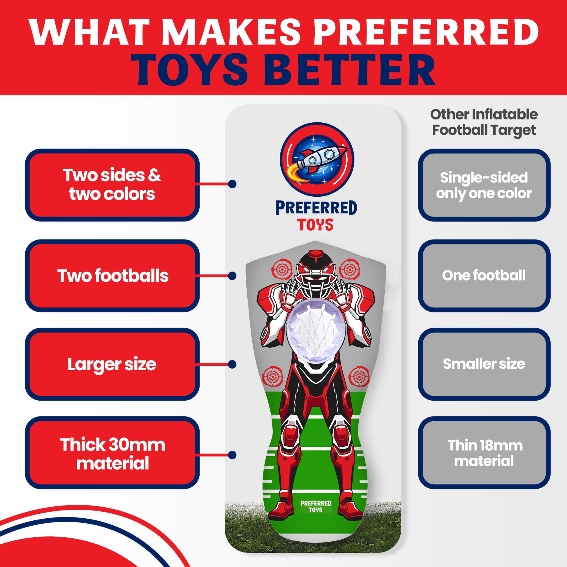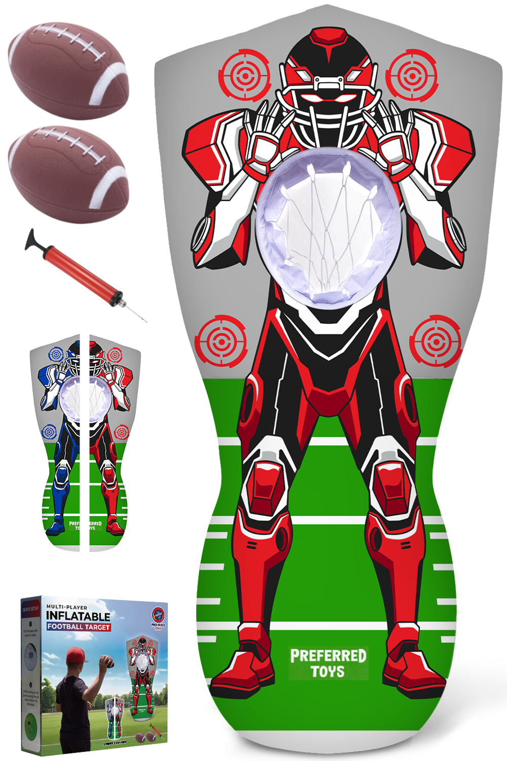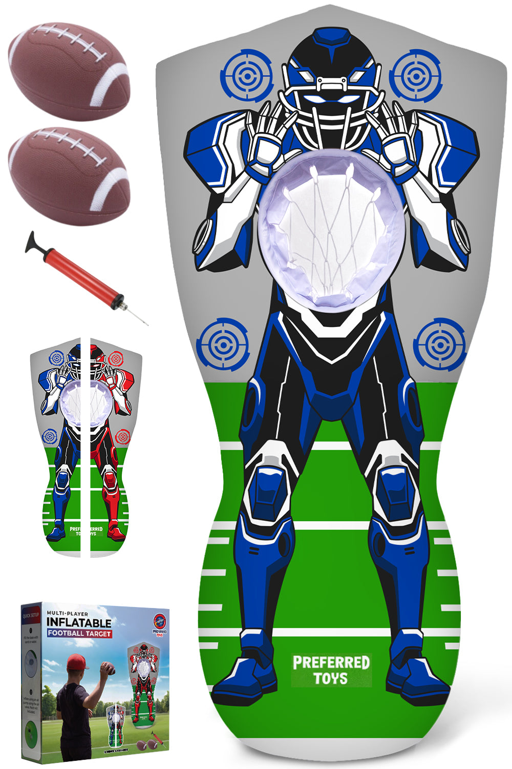 THE FUNNEST INFLATABLE TARGET: Our inflatable football target flips to reveal two sides, red and blue, for twice the throwing challenge. Each side features 4 targets and a net, letting your kids practice or play with friends