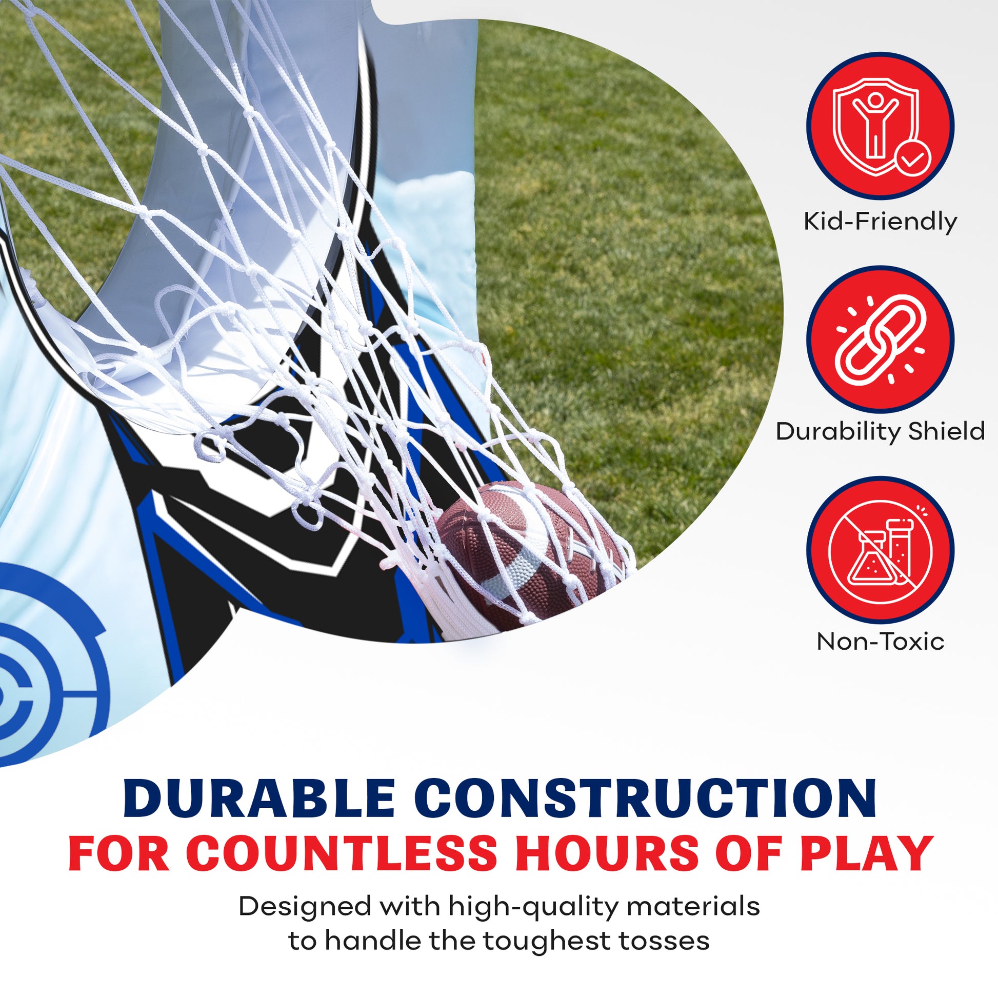 Lace up! Football practice just got seriously fun. Watch your little NFL hero master their throwing and shooting skills while having a blast. This 65” football target for kids includes two footballs, one air pump, a patch kit, plus four targets and a sturdy net to seamlessly catch every throw and kick. Enjoy dual-sided action and choose either a striking red or blue design, offering adaptive gameplay for football mastery.