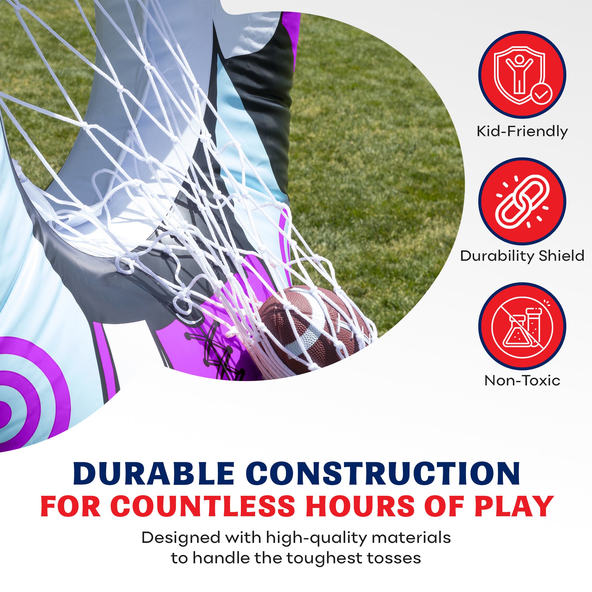 THE FUNNEST INFLATABLE TARGET: Our inflatable football target flips to reveal two sides, red and blue, for twice the throwing challenge. Each side features 4 targets and a net, letting your kids practice or play with friends